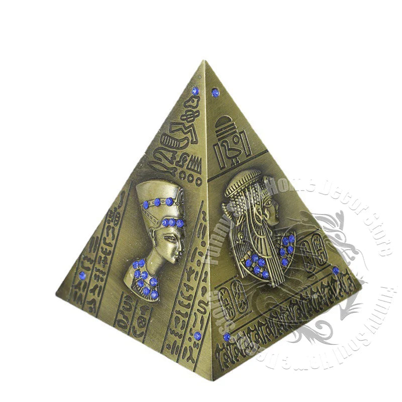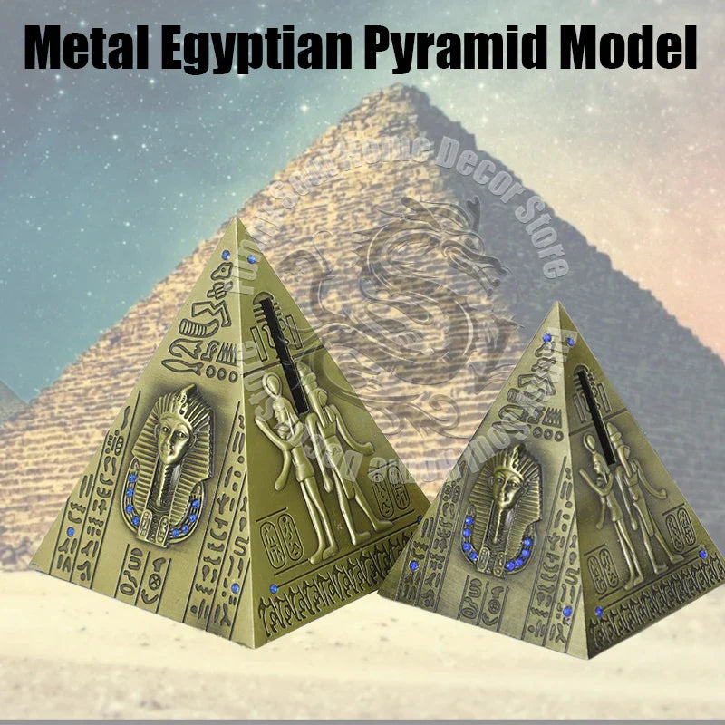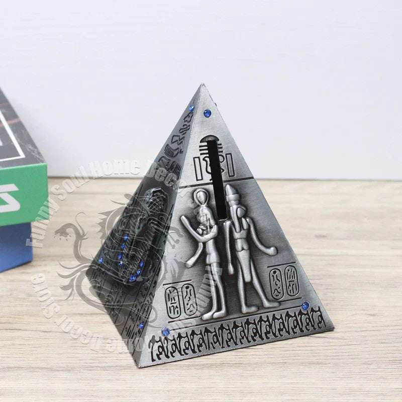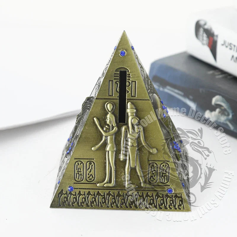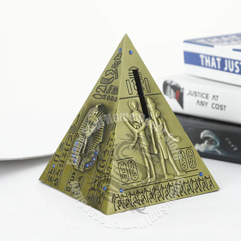Bring a touch of ancient Egypt to your home or workspace with this intricately designed metal pyramid model that doubles as a coin piggy bank — a perfect souvenir and décor piece!